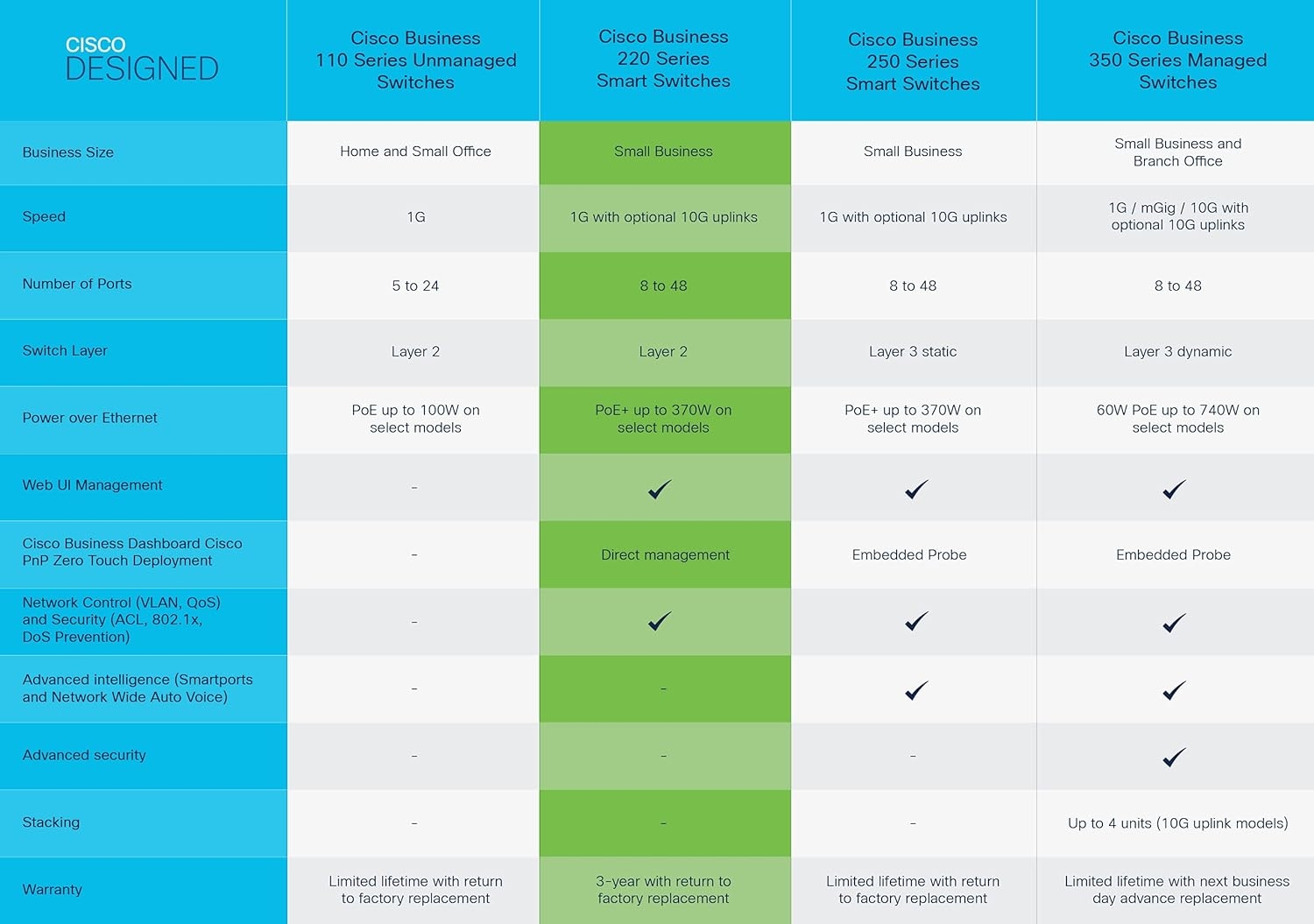 The Cisco Business CBS220-8P-E-2G switch is simple and affordable smart switch for business-class network. CBS220 series bridge the gap between the affordability of an unmanaged device and the ease-of-use of smart switches. With their intuitive dashboard, mobile app support, and multiple Power over Ethernet (PoE) options, these switches deliver a solid business network.