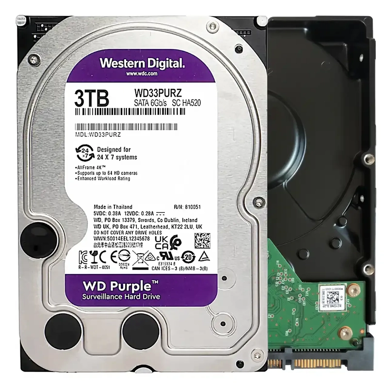 **WD Purple WD33PURZ 3 TB Hard Drive**: A high-capacity 3.5″ internal HDD designed for 24/7 surveillance systems. Features SATA/600 interface, 5400rpm speed, and 3TB storage optimized for continuous HD video recording. Built with AllFrame technology to reduce frame loss and ensure smooth playback, it supports up to 64 cameras simultaneously. Engineered for durability in always-on environments, it offers enhanced compatibility with AI-enabled security systems and RAID configurations. Ideal for reliable, high-performance surveillance storage with low power consumption and minimal heat output.
