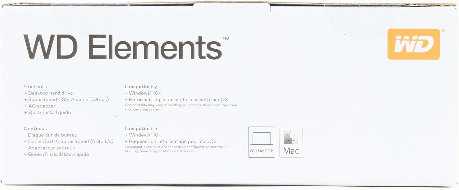 WD Elements Desktop Storage with USB 3.0 delivers reliable high capacity, storage expansion, fast data transfer rates, and universal connectivity with USB 2.0 and 3.0 devices. Its sleek design features over 12TB of capacity, coupled with WD quality and reliability.